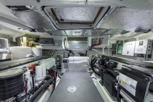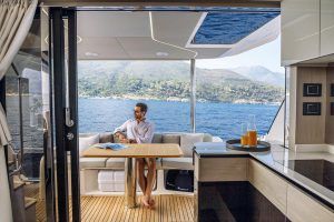 The flybridge is large, well-organized, and equipped with a BBQ station. There is a generous relaxation area and a large sunpad alongside the helm station, allowing you to navigate surrounded by friends while being immersed in the panoramic view.