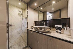 The flybridge has no steps front to aftwhile the dashboard, centrally and ergonomically placed, allows for the presence of a sun lounger that can accommodate up to five people. Aft on the bridge is a spacious living area with a U-shaped sofa, a teak dining table, and a galley equipped with a refrigerator, an ice maker, a barbecue, and a sink. All of these amenities make the terrace the perfect spot to enjoy the most beautiful hours of the day.