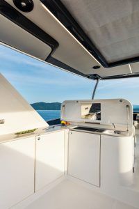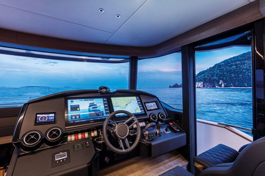Outdoors, relaxation is ensured by the sun loungers on the flybridge and in the bow area, reachable with ease and maximum safety. On the upper deck, you find a central helm station, a comfortable bar cabinet, a dining table with two sofas, and a panoramic, protected terrace. The bow area has an enviable sundeck, reachable thanks to wide, side-walkways and ergonomic handrails.