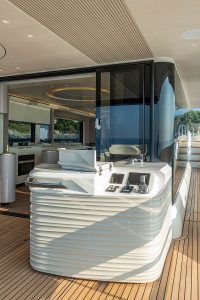 The exterior spaces of this yacht are distinguished by dynamic and captivating lines, featuring a spacious and redesigned flybridge and a comfortable terrace cockpit.